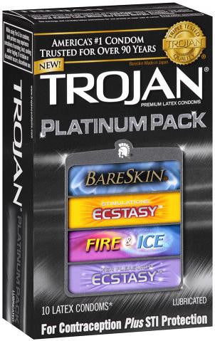 The Trojan Platinum Pack is a premium collection of innovative condoms offering an exceptional variety of sensations for the ultimate pleasure experience. Assortment includes 2 Bareskin Condoms - thinner than standard condoms, 2 Stimulations Ecstasy - Comfort shape plus deep ribs to increase stimulation, 4 Fire and Ice - Dual action lubricant with warming and tingling sensations for both partners, 2 Her Pleasure Ecstasy - Comfort and shape plus texture for female stimulation.