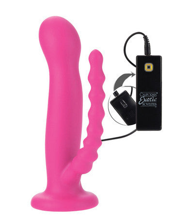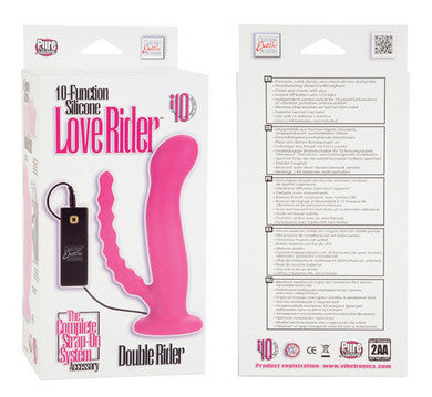 Accessory for The Complete Strap-On System. Premium solid sturdy unscented Silicone dual probe. Flexes and moves with you. 10 powerful functions of vibration pulsation and escalation. Instant off button LED light. State of the art controller with memory chip that resumes last function used. Auto on and off button. Flanged base for use with most harnesses. Superior suction cup base for versatile use with out without harness.
