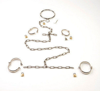 Stainless Steel restraint set with locking Neck collar Wrist cuffs and ankle shackles. This is a complete bondage set made out of rounded stainless steel polished to a mirror finish. The wrist cuffs and ankles shackles are oval shaped for an easy comfortable fit over large and small wrists and ankles. The collar closes with a flush mounted allen screw. The wrist and ankle pieces close with a lock and hasp. 5 common keyed padlocks are included with the set. Each of the piece may be romoved and used separately for a variety of bondage play variations. The wrist and collar are so finely polished they could easily double as jewelry pieced worn separately. This is an attrative addition to any equipment collection priced reasonably and affordable.
