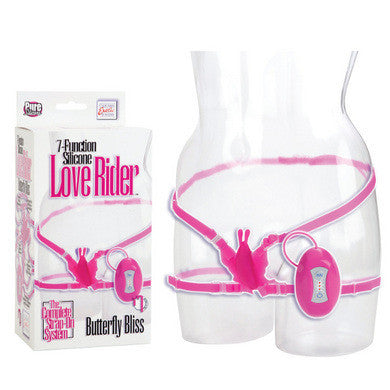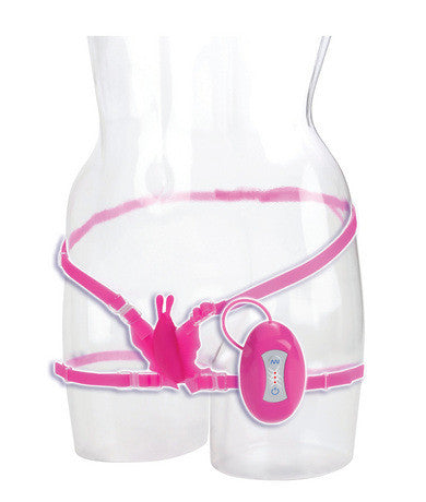 Full contact vibrating Silicone butterfly with fluttering antennae and textured body. May be worn for solo play or while making love. 7 functions of vibration pulsation and escalation. Power resonates throughout. Easy touch controller with LED and auto on and off button. Fully adjustable removable Silicone waist and thigh straps. Waist adjusts and stretches up to 43 inches.