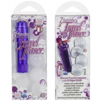 Discreet, quiet travel massager with 4 unique interchangeable heads. 7 powerful functions of vibration, pulsation, and escalation. Easy push button control.
