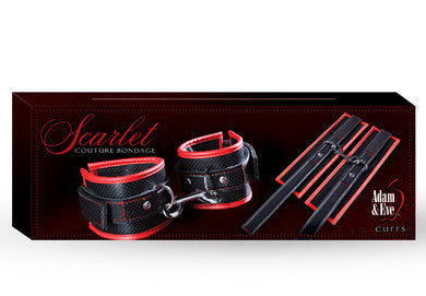 Explore just about any erotic position with these vegan leather hand or ankle cuffs. These metal studded black and scarlet cuffs gently hold your lover in place creating endless arousing possibilities. Take your partner captive and see where the encounter leads. Velcro bindings for ultimate comfort and easy release.