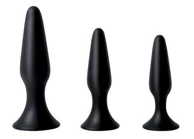 Make sure your anal exploration goes as smooth as silk with this set of training butt plugs that go from tiny to robust in three graduated sizes! Use plenty of lubricant as you begin with the first size and slowly work your way up from there. The flared base gives you peace of mind for easy retrieval, and clean up is a snap with Adam and Eve toy cleaner and hot water rinse!