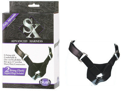 SX For Advanced Harness is an evolution in adjustable strap-on systems. Comprised of 2 strong silicone support rings theres no need to measure dildos ever again. Fasteners secure the support rings making SX For Advanced Harness compatible with all dildos - even extreme dildos. Heavy Duty constructed strap-on harness is for beginners to advanced players. The performance pad and adjustable straps are constructed from velvety smooth faux leather for comfortable wear. SX Advanced Harness fits up to a 52 inch waistline.