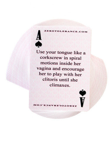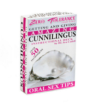 Looking to improve your cunnilingus techniques. Feel like the same-old licks arent doing it for her anymore. Then you need Cunnilingus Cards from Zero Tolerance Toys. Renowned sexpert Dr. Ava Cadell shares with you 52 explicit techniques that tell you exactly what to do with your tongue fingers and even toys. Acting on these inspirational instructions will bring you and your partner to dizzying heights of pleasure with the most amazing oral sex of your life.