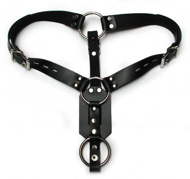 This Anal Plug Harness With Cock Ring has a built-in plug pouch to fit most average sized butt plugs or flared based dildos and comes with a 2-inch steel cock-ring in the front. The cock-ring can easily be changed with snaps. It is designed like a belt with two locking buckles on each side. The spaces between the rings, plug pouch, and waistband are also adjustable, allowing for a perfect fit.
