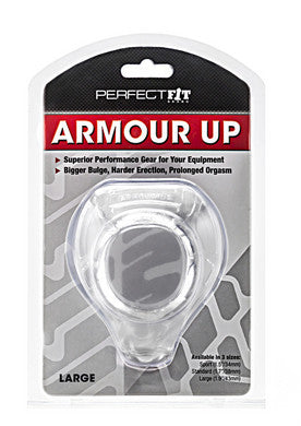 Armour Up is a slimmer and thinner version of the best-selling Cock Armour for bigger bulges enhanced erections and more intense orgasms. It is designed with a revolutionary anatomical shape that hugs your torso and pushes your gear out entirely from your body to enhance your penis and scrotum. Armour Up is made of PF Blend which is a proprietary blend of Silicone and TPR developed to provide superior stretch comfort and durability. Armour Up Large comes in 1.9-inch -43mm.