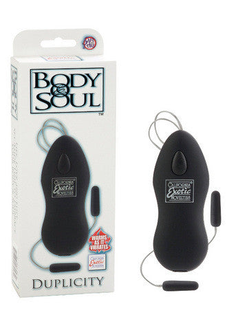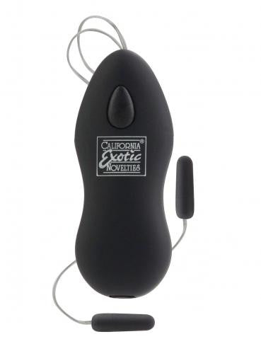 Warms as it vibrates. Whisper quiet dual micro bullets. 2-speed. Incredibly powerful. Ergonomic battery pack with push button control.