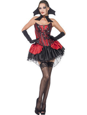 The Seductive Vamp Costume includes a corset dress with attached red black and lace petticoat with lace detailing and a victorian gem on front. Lace up back for cinching and a black vampire collar. Fist dress size 10-12. Display bag packaging.