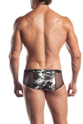 Be stylish with this trendy camo print. This sexy low rise camo print brief with fishnet panel sides is perfect to show off your sexy abs. Made from soft, stretch polyester and spandex. One size fits waist sizes 28-36 inches.