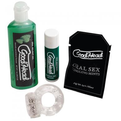 Transforming average head into Good Head! The Good Head Kit for HIM provides all the essential oral sex tools to make something already wonderful even more wonderful. Flavored Good Head lip balm will keep your lips soft and ready for that special below the belt kiss. Delicious cool mint Good Head gel tastes so good you wont ever want to come up for air. Pop one of the oral sex tingling mints in your mouth and unleash a tingling frenzy. Slip on the one size fits all disposable vibrating love ring on him or over your palm and watch him light up with joy! Think you know everything about oral sex? Learn some new tricks with the included Good Head tips card. Kit includes 1 fl. oz. (29.6 ml) Mint flavored Good Head Oral Gel, 4-Pack of Tingling Good Head oral sex mints, Flavored Good Head lip balm, Vibrating love ring (1 cell battery included), and the Good Head for HIM tips card.