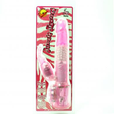 The Jungle Jiggler Bunny is a trip on the wild side of passion. This 7-inch Vibrator is made of a soft jelly material that will warm to the body. It's dual rotational shaft is filled with pleasure beads whose motion in either direction will make you howl like a wild animal, while the powerful clitoral stimulator rocks your senses. Easy to use multi-speed controls at your finger tips.