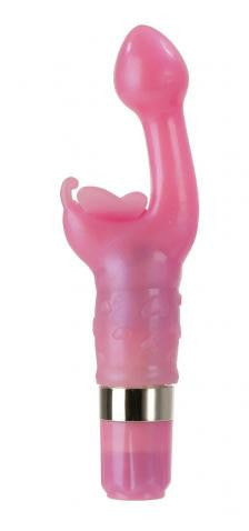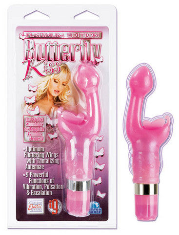The Butterfly Kiss went platinum. This is a powerful arouser with a fluttering butterfly and a sensually soft G-spot stimulator. The Butterfly Kiss features nine functions of vibration, pulsation, and escalation and an easy push-button control.