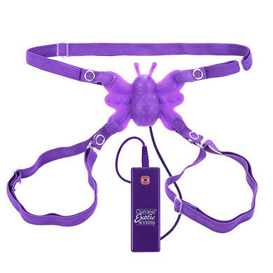 Full contact vibrating body hugging Silicone Butterfly with fluttering antennae. May be worn for solo play while making love. 10-functions of intense vibration pulsation and escalation. State-of-the-art memory chip resumes last function used. Auto on and off button. Universal plug-in jack. Fully adjustable removable waist and thigh straps. Waist adjusts and stretches up to 50 inches.