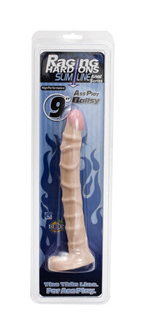 Doc Johnsons 9 inch Raging Hard-On is created for supercharged, anal satisfaction. Flexible, slim shaft and surging texture supply ample satisfaction to intensify orgasms. The ball sac doubles as a stable base perfect as a grip for grab and push action and for posting on a flat surface. Flared base also makes the Raging Hard-On Ballsy suitable for strap-on harnesses. Made from non-phthalate body safe material, which inlcudes Doc's anti-bacterial Sil-A-Gel formula and is proudly made in America.
