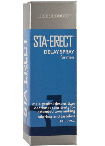 Get more banging for your buck with Doc Johnson's Sta-Erect spray. Contains 7.5% benzocaine which acts as a desensitizing agent to help the man delay or prevent premature ejaculation. Odorless and tasteless.