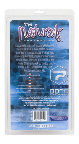 The box says it all: The natural feel, the natural look, the natural choice. The Naturals line presents Thick Dong With Balls, a rugged 7 inch flexible PVC cock with realistically-textured balls, engorged veins, and a thick shaft and head. Hand-colored for an extra touch of realism, they are made in USA with Doc Johnson's revolutionary anti-bacterial, phthalate-free Sil-a-Gel process.