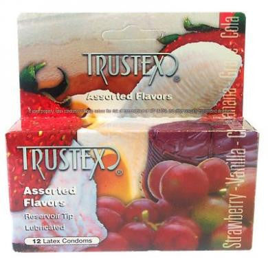 Trustex Assorted Flavors Lubricated Condoms: Assorted Flavors: Vanilla, Strawberry, Chocolate, Banana, Grape, Cola, Mint. Each condom color and scent is designed to match the condom's flavor. Features: lubricated, reservoir tip, smooth texture, FDA approved.