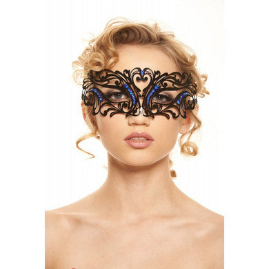 Elegant and seductive laser cut mask with blue crystal diamante detail. Double faced satin ribbons.