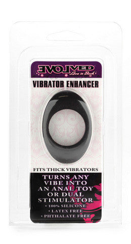Turn any toy into a double duty performer with this unique Vibrator Enhancer. Latex and phthalate free this pure silicone ring fits over any vibrator to offer extra clitoral stimulation or a safety stopper for anal play. The ring itself provides external stimulation and the flared base keeps any toy from slipping too far.