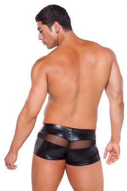 Show off in these provocative wet look shorts with revealing sheer panels. Mesh front and side inserts. Fits most S-L sizes.