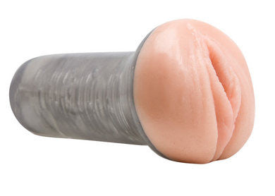 CyberSkin pussy stroker molded from Asphyxia. Hand painted pussy lips with a ribbed inner tunnel that alternates between a tight and tighter grip. Raised pink Cyberskin nubs that tease the tip upon entry. Narrow stroker is easy to hold on to. Translucent Cyberskin lets him watch.